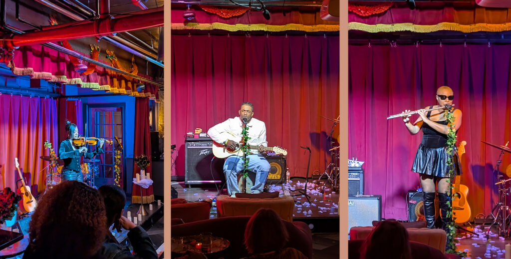 Between songs, she takes time to share her appreciation for the crowd, her collaborators, her mom (which garners another extended ovation), Velvet Whip, and to share personal anecdotes about her life. She tells us that the venue’s couches and upholstered seating remind her of the living room in her childhood home and of her memories of singing for hours into the TV remote, performing to an imagined audience. It’s a poignant moment as we all witness a young woman who has manifested the beginning of her dream.